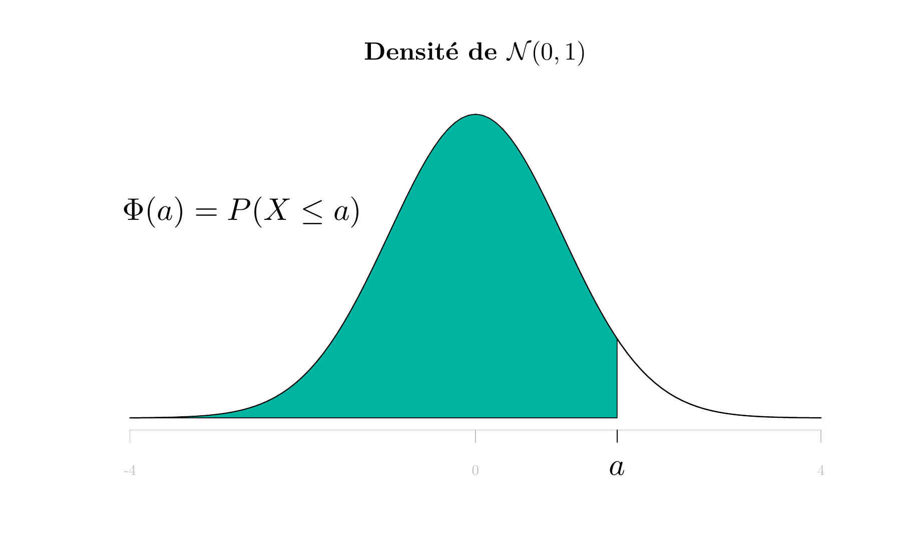 \(X\) étant une variable aléatoire de loi \(\mathcal{N}(0,1)\), la table donne la valeur de \(\Phi(a)=P(X\leq a)\). En , la commande correspondante est pnorm(a).